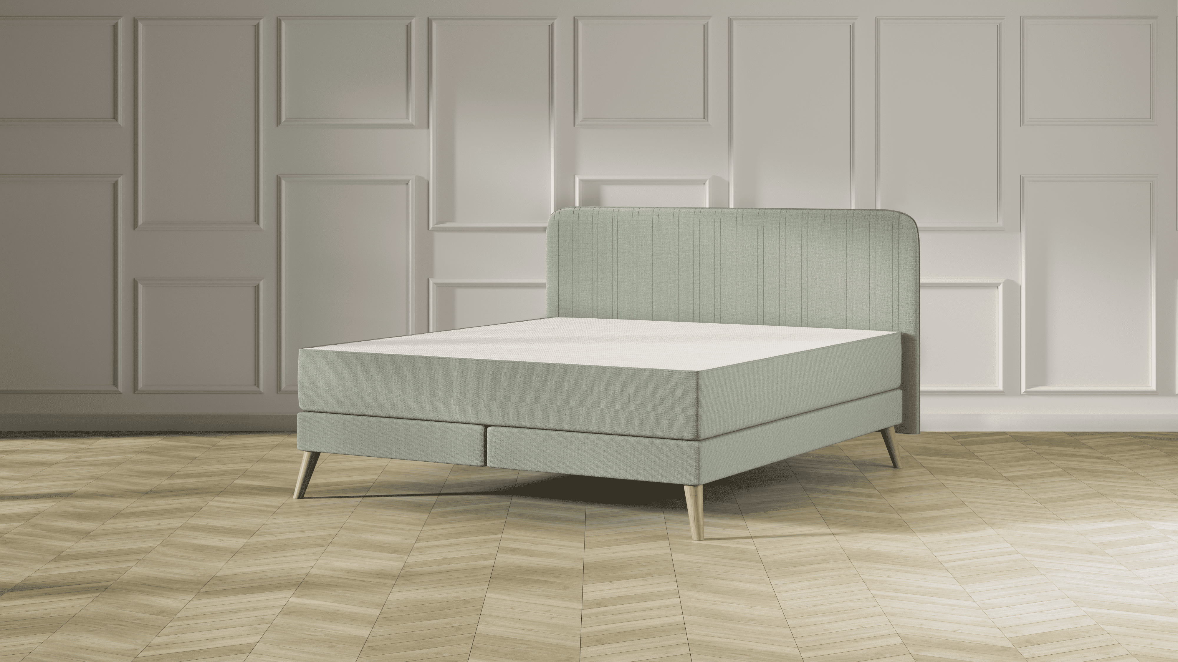 Die hochwertige Basis aus massivem Fichtenholz überzeugt mit einer eleganten Form und individuellen Gestaltungsmöglichkeiten. Wähle zwischen eckigen oder abgerundeten Kopfteil-Designs in verschiedenen Stofffarben und entscheide dich für Bettfüße aus einer exklusiven Auswahl.