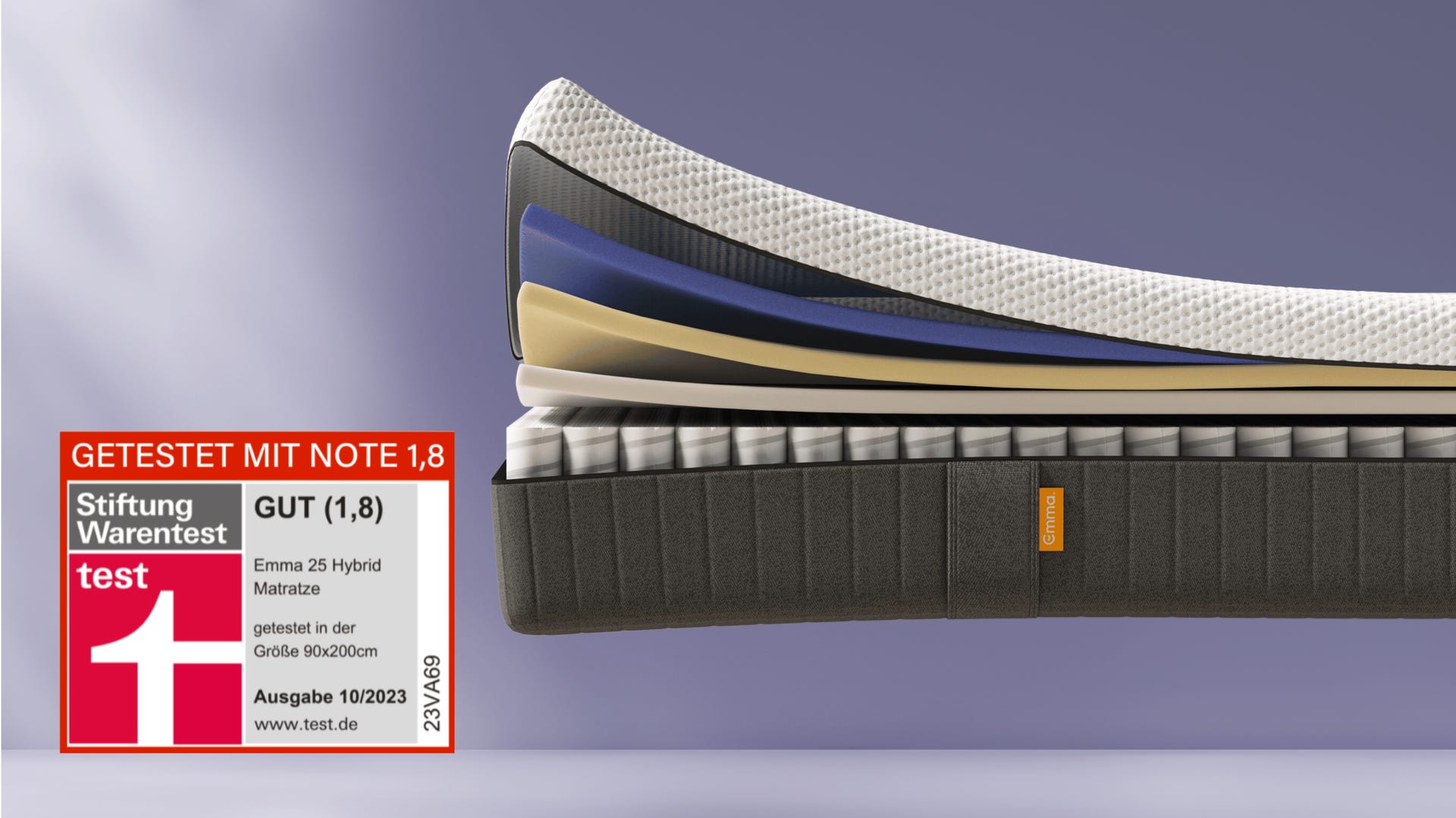 Emma 25 Hybrid Matratze mit Stiftung Warentest Note 1,8 (Gut), getestet in Größe 90x200 cm, Ausgabe 10/2023.