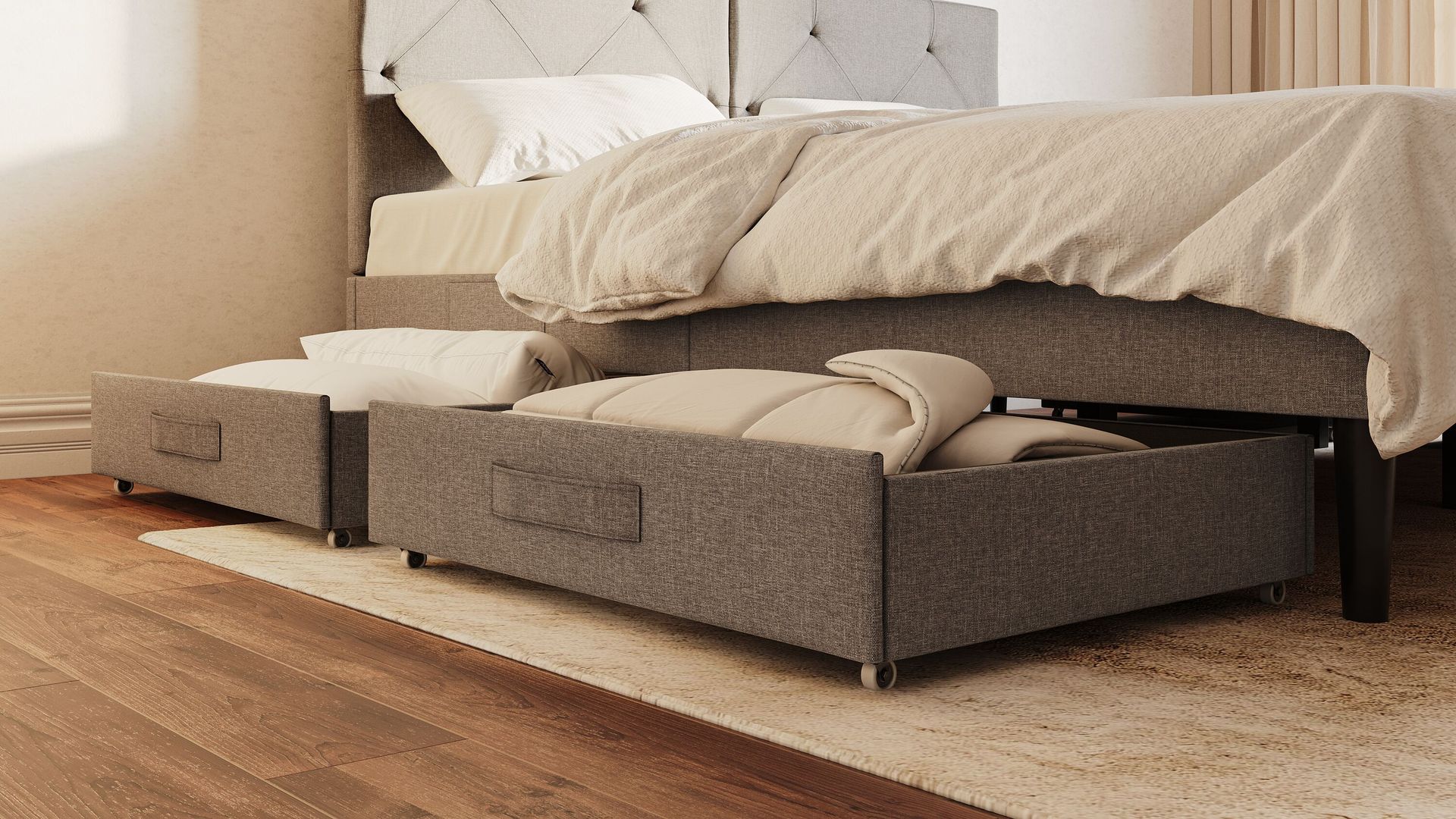 Wenn Du zur Tasche an der Bettseite noch mehr Stauraum brauchst, haben wir die perfekte Lösung für Dich: unsere passenden Unterbett-Schubladen für Dein Polsterbett. Damit wird die Lagerung von Winterkleidung, Bettwäsche oder anderen Dingen zum Kinderspiel. Und das Beste? Es bleibt alles staubfrei. Zwei oder vier Schubladen? Du entscheidest!