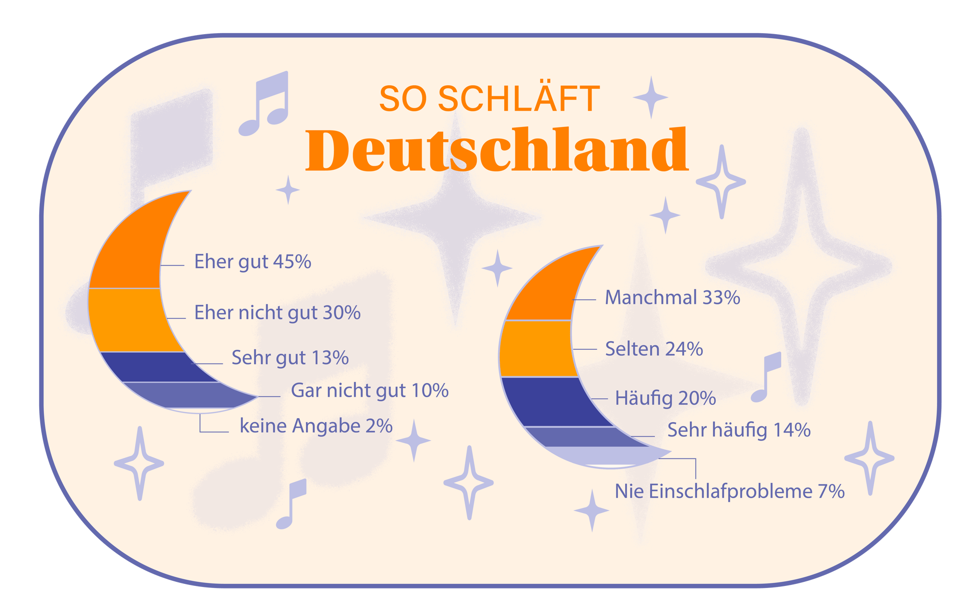 Sie ist für jeden leicht zugänglich und trägt uns ohne unerwünschte Nebenwirkungen in den friedlichen Schlaf. Dabei lässt sie sich leicht dem jeweiligen Musikgeschmack anpassen, um eine individuell maßgeschneiderte Schlafumgebung zu schaffen. Egal, ob sanfter Kuschelrock, beruhigender Rap oder entspannender Pop - durch die große Vielfalt der Musik kann jeder in den erholsamen Schlaf finden." – Emma Merritt, Schlafexpertin